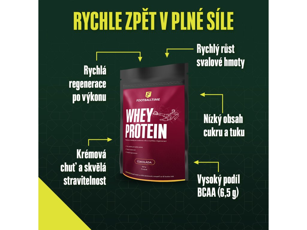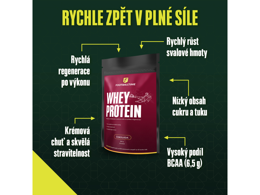 "Ten je po zápase jak pytel brambor!" Franz by ti naordinoval tatarák, my ti nabízíme kvalitní alternativu. Protein je základ stavebních kamenů pro tvoje svaly a je nezbytný pro udržení a růst svalové hmoty. FootballTime Whey Protein je navržen tak, aby poskytoval vysoký obsah dobře využitelného syrovátkového proteinu s 22 g bílkovin na dávku, což je skvělý nástroj pro kvalitní doplnění bílkovin s nízkým obsahem tuku a cukru. Je ideální pro všechny fotbalisty, kteří chtějí podpořit svou regeneraci a zajistit maximální využitelnost pro tělo.